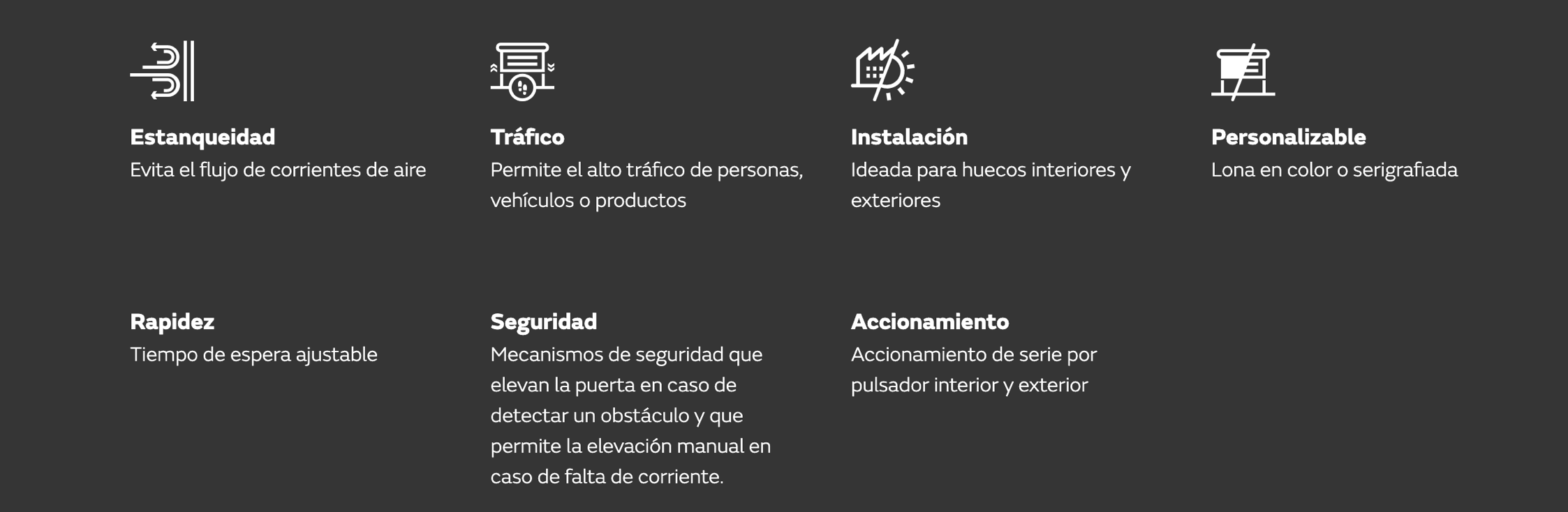 La puerta rápida de acero enrollable de Ferroflex ofrece una solución idónea para zonas de tráfico intenso de vehículos y maquinaria móvil así como de peatones. La puerta rápida enrollable de acero es la mejor solución para zonas de tráfico intenso, como almacenes o muelles de carga. Gracias a sus medidas compactas nos permite instalarla en naves industriales para sectorizar distintas zonas de trabajo. Ofrece también una resistencia al viento óptima para prevenir corrientes de aire, incrementando el confort en las zonas de trabajo de los operarios. Nuestras puertas rápidas de acero tienen la versatilidad de adaptarse a las necesidades del cliente a través de las distintas opciones y configuraciones que ofrece.