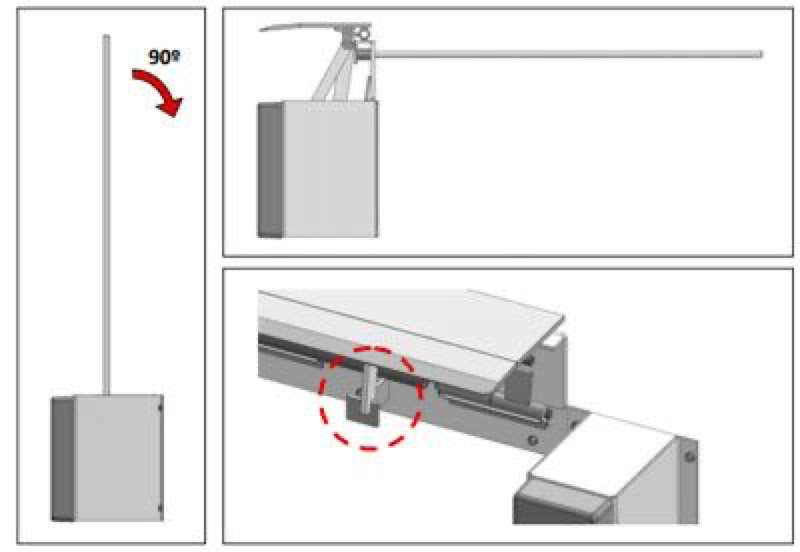 1. Se introduce la palanca de manejo en la cavidad ubicada al lado de la plataforma y se tira de ella hacia atrás. La plataforma se elevará por acción de los resortes hasta quedar en posición vertical y anclada por la barra de anclaje.
