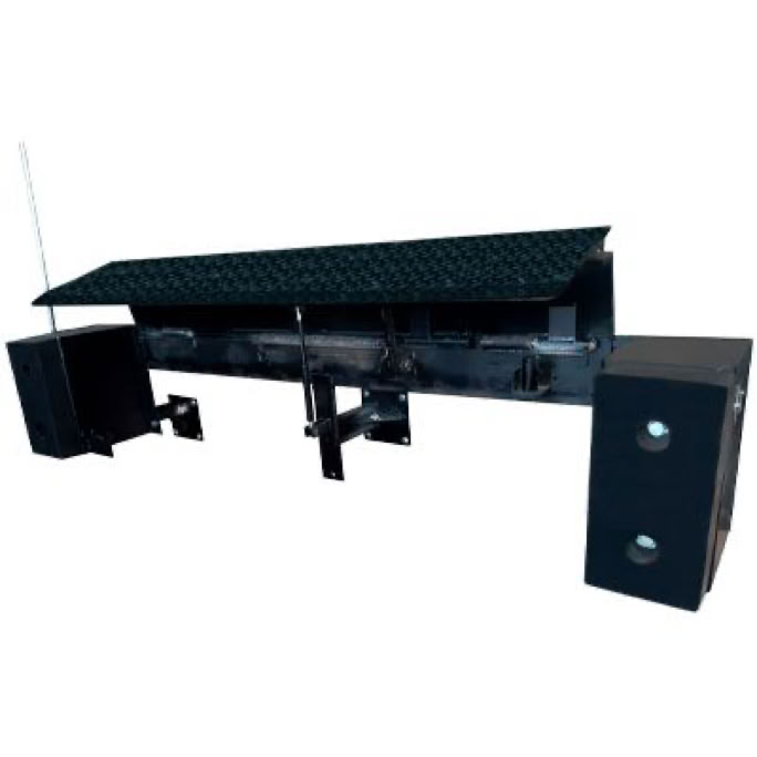 - Lateral: las planchas desplegables impiden introducir los pies a los operarios y las bandas de color resaltan la posición de la rampa cuando no está en reposo.